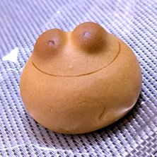 カエルまんじゅう 桃山生地で小豆餡ベースの生地を包み込み、かえるの顔を模したお菓子です。ひよ子とも似たお菓子ですが、ひよこよりも桃山生地は薄いかと思います。小豆餡ベースの生地も美味しくって素敵なお菓子です。