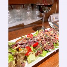 大雨の中出社。 みんな用心して早く帰る中、頑丈な路線なので関係なく普通に残業。 すっかり遅くなって疲れ果ててるときにココがあいててくれてよかった。 タンパク質の摂れる山盛りのサラダを発注。 お通しをローストビーフ寿司にしてくれた💕