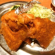 新潟名物、若鶏の半羽揚げ❗️もちろんカレー味(笑)食べやすいようにカットしてもらいました。熱々ジューシーで美味いε-(´∀`; )