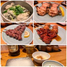 焼き鳥、蟹サラダ、釜飯、ビールと熱燗の黄金比セットです😃 釜飯はいつもの通り、残りはお持ち帰りです(^^)