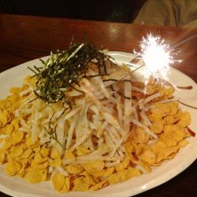 大根バリバリサラダ。花火が添えられてきてビックリした‼ (゚o゚;; しかもコーンフレーク添え。珍しい^^; お味は○でした!