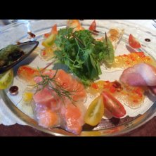 本日のご褒美ディナー 右上から ローストチキンのハーブソース アオリイカと小魚のマリネ パンプキンスープ ステーキとサラダとパン 柚シャーベット スイカ オレンジ コーヒー 独りぼっちも、これだけ続くと、さすがに慣れたな…(*´艸`)