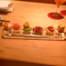 季節の前菜 奥から反時計回りに 桜鯛のカルパッチョ、菜の花とわかめ添え。 タイラギの黄身酢 イカ墨のゼリー、生うに乗っけ。 ウスイエンドウの胡麻豆腐、甘エビ乗せ。 ケンサキイカの若竹和え。