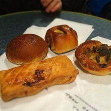 Gontranのパンで遅いランチ♬ 今回特に気に入ったのは、左下のショソン・カンパニャール。 ジャガイモ・ベーコン・オニオンをローズマリーで風味付けしたのがパイに入ってて、ホクホク美味しい♡