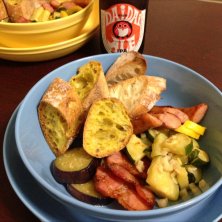 今晩はGontranのプレーンバゲットとカレーバゲット♬ 持って帰る時に、袋の中からすごく幸せな香りが♡ 黄と緑のズッキーニ、ナス、ソーセージ、ベーコンのバジルソテーと一緒にいただきます!