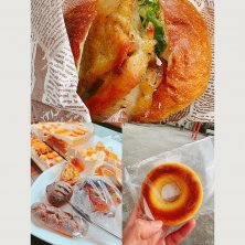 久々に来たよ 定番は電話予約しておいて、朝ごはん用に、焼きたてのフランク ベーグルのブルーベリーサンド🥯 写真撮る前に食べてしまった 新作のレモンベリーブリオッシュ うん、ブリオッシュは思ってたよりパサついてたかな