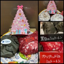 嬉しいことがありました!クリスマスプレゼントが贈られてきました。 先日大阪の次男のところに遊びに行き、宇治に行った時に買おうとしたらすごい列で諦め、素通りに。 なんとなんと、嫁が再度たま木亭に行って送ってくれました、2種類のシュトーレン! 3歳と7ヶ月の乳飲子を乗せて。もう有り難すぎます。 嬉し過ぎます。言葉がありません。 その優しさに!