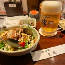 名物『鶏ももの文蔵焼き』 マヨネーズと胡椒が効いたソースを鶏ももにかけてオーブン焼きされていると思います☆ マヨ好きには間違いないっ!胡椒もピリッと効いててビールが進みました(≧∇≦)