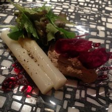 ホワイトアスパラのレバームース添え。