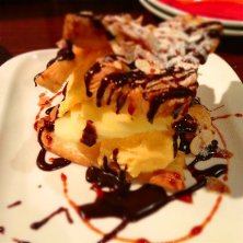 りんごのミルフィーユ。パイ生地にバニラのジェラートとりんごを重ね、スライスしたアーモンドとチョコレートをかけて食す。ブラックコーヒーにも合います。