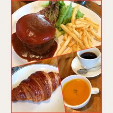 ふっくらジューシーハンバーグ フレッシュトマトとチーズオン! 永遠のクロワッサン かぼちゃのポタージュとコーヒー ハンバーグも美味しかったけど、クロワッサンがバターたっぷり使った味がして好きでした♡