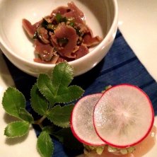 酒肴盛り合わせ。ささみの昆布〆、山形だし掛け、砂肝のにら醤油和え。鳥料理コース。