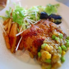 日替わりランチの鶏もも肉のポワレ。ソースが美味しく、ポテトフライもついてボリューム満点、コスパ良しランチ♡