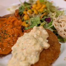 【若鶏かわり揚げと白身魚ラビゴットソース】 今週は池袋サンシャイン文化会館で展示会出展 今年は頼もしい後輩たちにブース対応を委ねて 自分は他社のブースを見て周り情報交換が出来た ランチは口コミの評判が良かったイタリアンダイニングバルで日替わり2種盛りランチ🍽️ 白身魚のムニエルが特に美味しかった〜😋