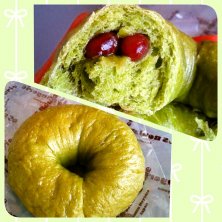 エスコヤマの抹茶ベーグル。 70g強の小振りなベーグルちゃん。 もちっとむっちりタイプの生地に甘い粒のしっかりした大納言入り☆