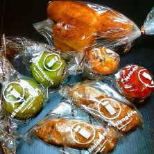 コヤマロールと一緒に貰ったパン達☆ バケットにぶどう食パン、抹茶ベーグルにドライフルーツのバトン、マフィン2種! めっちゃ冷凍庫が賑わってて食べるのが追い付かない~(*´∀`*)
