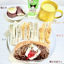 晩ご飯😃 キッチンポテトのサンドイッチ😋 蘇我の芝浜で買ったまぐろフライ😋 新潟ゆのたに心亭のおにぎり🍙魚沼仕込 焼鮭😋 スンドゥブチゲも作ってみました😋