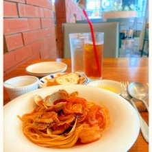 🌸魚介ペスカトーレ 🌸ピーチティー 今日は体内メンテナンスの日😊 胃カメラや腹部のエコーなど無事に終了✨ ホッと一息のブランチ💕 人気のお店だけどオープン直後でお客様もまだ少なく ゆっくりと魚介の旨みを堪能しながら食べれました😊 それにしても毎年お世話になってる病院だけど リニューアルして大きく広く豪華に変身しすぎてて びっくり😳