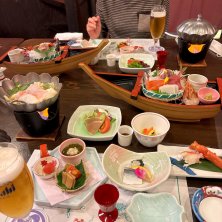 土肥温泉での昨日の夕食😊 半個室のお食事処で仕切られてるので他のお客さんの顔を見る事なく食事ができました😌 舟盛り、アワビ、蟹などごちそうがたくさん🥰 🍺に🍶も飲んで、お腹いっぱいに🤗
