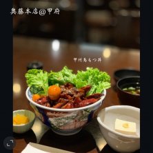 【甲州鳥もつ丼】#コツコツ造血 ➡️ 甲府に無事到着し SEとの待ち合わせ時間まで小一時間を確保 ならば駅前の店で甲府名物でも いただいておきましょうか 特急あずさでのすだち蕎麦がきいて 今回ほうとうは見送り甲府島もつ煮を 選びました 新鮮な生の鳥のレバー・ハツ・砂肝・ サン(生まれる前の卵)が甘辛に煮込まれ 丼仕立てになっています こちら「縁をとりもつ」と言うことから 縁起のよい料理とも言われているのだそう 鉄分はもちろん ビタミンAも豊富な鳥のレバーで しっかり力をつけて現場入りです
