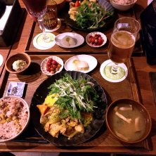 お肉料理定食 野菜のサラダバーが有名らしいけど、そんなに食べたい気持ちではなかったので頼まず…。野菜が売りのお店だけど、定食についてる野菜はかなり貧相(笑)お味噌汁はカスみたい野菜がちょろっとだけ入ってた。