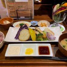 グリル野菜の定食 ずっと行ってみたかった『やさいの王様』へ🍅🍆🥕 甘味が出て贅沢な野菜ももちろん、六穀と青豆ご飯やお味噌汁も好み~♡ 今度平日お昼のお弁当もトライしようっと♫