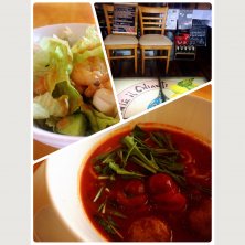 モンテイルキャンティ ・サラダは必須です❗️ドレッシングが好き💕 ・海老の濃厚トマトソース生パスタ ・石焼リゾット 鮭、明太子、舞茸、紫蘇 ・バナナジュース🍌 星乃珈琲のマロンスフレ