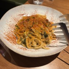 信州ポークと七味唐辛子のクリームパスタ とにかく早い!サラダ食べ始める前に来ました。 ゆっくり食べたい場合は、一品ずつオーダーする方がいいです。七味唐辛子はクリームソースに少し消され気味なので、追い七味した方がいいかも★★☆☆☆