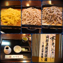 三色大もり : 変わり蕎麦,せいろ蕎麦,田舎蕎麦 三枚順番に提供されます(^-^)/ 最初は変わり蕎麦の柚子きり蕎麦٩( ᐛ )و レモン色の細い蕎麦^ ^ 喉越し良く、柚子の風味良く、腰のある 美味しいお蕎麦です(o^^o)