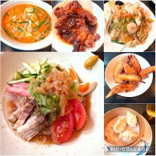 お昼ご飯)^o^( 今日は盛りだくさん! いつも焼きそばだったけど、冷やし中華発見したからそれにしてみた😆 おいしー!!! ニンニクラーメン カタ焼きそば 豚足 手羽先 フカヒレ餃子🥟 お腹いっぱいで帰るのめんどくさい…