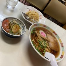 静岡駅南口にあるおにぎりのまるしまが今年いっぱいで閉店の為、寄ってみたらやってなかった。 だから、その向かいのファミリー食堂さいとうでランチをとることにした^ - ^。こちらも昭和レトロ。 メニューが壁いっぱいに貼られて、店内も昭和!親父ギャグを飛ばしまくりのご主人も昭和! ラーメン🍜餃子🥟セット(800円)を。 昔ながらの醤油ラーメン。固めの麺が汁にうまくからんでよし。 餃子は焼き加減、皮、具、これはパーフェクト!一つの完成形。素晴らしい👏。 ご馳走様さまでした^ - ^