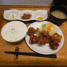 八丁堀ミッション完了からの お昼ごはん🐱 からあげ定食🐥😋 690円(税込)✨ 「あすなろ」の自然農法 北広島町産 コシヒカリ🌾 広島の川中醤油 四国産 麦味噌を使用した 合わせ味噌 山口県岩国市の老舗「うまもん」の 無添加の漬け物