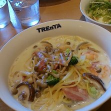 欲張りクリームスープパスタ✩ お野菜、ベーコン、海の幸すべてが入ってるクリームパスタ✩ 具沢山で、ややあっさり目だけどしっかりしたスープがパスタと絡んで美味しかったー!!