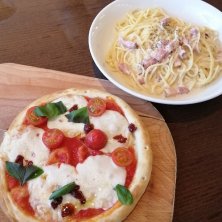 今日のランチ マルゲリータピザ+熟成ベーコンのカルボナーラ をシェアして食べました