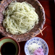 縁結びそば~♪750円 さらしな生一本~♪750円 もう少し蕎麦を食べたかったので、ランチは石段登って足に乳酸を溜めながら織姫神社境内にあるこちらへ。 一本の麺が紅白になっている変わり蕎麦の縁結びそばと、前回冷たい汁蕎麦で頂いたさらしな生一本をざるの方で注文。 縁結びは紅白の蕎麦との事ですがピンク色に見える細打ちの蕎麦。 色は何れにしても風味・喉越し共に良く美味しいです(*^ω^*) さらしな生一本は縁結びより更に細く、そのせいかざるに盛るとちょっとダマに。 でも味と口当たりは相変わらず◎