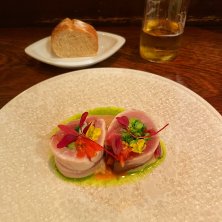 忘年会 キャビア、マスカルポーネ、ポテトマッシュののったポテチと、ふぁぐらとドライいちぢくのシュー