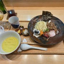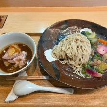 飯田商店@湯河原にて、つけ麺 しお味(麺少なめ)+お出汁割り(かつお)。 しょうゆらぁ麺に続いてつけ麺のしお味を麺少なめで連食。2種麺の個性的な味わいを徹底的に堪能するためのアイテム多数。それぞれに様々な発見がある楽しさよ♪ 麺友さんをお祝いして🎂楽しい集いとなりました👏🏻
