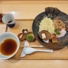 らぁ麺 飯田商店@湯河原にて、つけ麺 しお味+お出汁割り にぼし。 この日は春の様な暖かさでつけ麺日和。もっちもちの白い麺に歯応えのある黒い麺。今回は白い麺は温かいつけ汁で、黒い麺は山葵と共に冷たいめんつゆでシンプルに味わいます。 先につけ麺をいただき、次のスペシャルな一杯を待ちます…