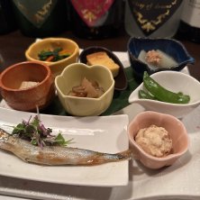 お通しプレート 銀杏のオリーブオイル漬け 新生姜の甘酢 炙り太刀魚 生春巻き 赤貝のヒモの酢の物 クリームチーズの鮪酒盗乗せ 鯛のネギ塩和え 林檎のコンポート