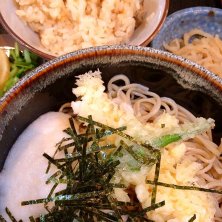 お店おすすめのの…日替わりのランチを食べました😊 冷たいお蕎麦の上には、小海老の天ぷら、鶏そぼろ丼、茶碗蒸し、かぼちゃ寒天あんこ添えのデザートもついてて、もーーう、お腹がパンパンになりました😊 おいしかったでーす💕