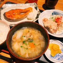 銀鮭の塩焼きと小豚汁🍗鶏からサラダ定食☀️ 今日少し仕事。お昼過ぎに終わり、今日こそ豚汁食べる〜♪って思ってたのに、少し生野菜も食べた気がしてコレ。初志貫徹するべきだった😅 人によるのか豚汁の盛りが少し少ない感じ。コスト削減か?でも、里芋含め10〜11種?の具材入りはやっぱり美味しい!😋 そして、唐揚げがちょっと揚げ足りない感じも残念だった。 でも、芋煮の季節にもなったから、私はこちらにまた食べに来よう♪😆笑