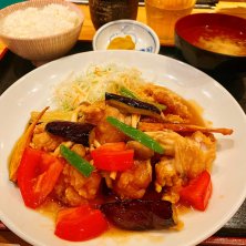 鶏と野菜の甘酢餡かけ定食** 午後少し仕事。早めに出て2ヶ月ぶりにこちら。 余裕あったのに、メニュー選びしくじって豚汁付かない定食にしてしまった😢 やはり同じもの食べ続けるのは苦手だな、笑。 お味は美味しいよ😋トマト🍅が生でさっぱりして良かった。 このお店では絶対豚汁、食べたくなる。迷った時は豚汁優先でメニュー選びする!😆笑