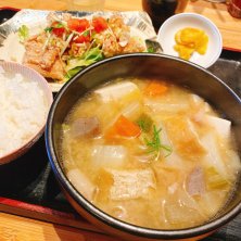 野菜たくさんの豚汁とから揚げ油淋鶏定食🕛 ここ数日唐揚げ🍗食べたいと思っていたのと、絶対がっつり食べたかったので、こちらへ。 豚汁には大きめ絹豆腐と厚めの油揚げ、蒟蒻もたっぷり入ってた🙌😋 油揚げ苦手なんだけど、厚めのは美味しい! 栃尾揚げ、久しぶりに買いたいなぁ♪