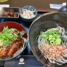 免許証の更新へ行った日のお昼ごはん 日替わりランチ ぶっかけそばとミニメンチカツ丼と小鉢 美味しくいただきました 1人ごはんはお蕎麦屋さんが入りやすくて良きです😊
