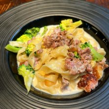モキチヴルスト特製 サルシッチャのクリームソース サルシッチャは塩麹仕込み ソースには熊沢酒造のどぶろく使用 フィットチーネに絡む、絡む 卓上のペペロンオイルで味変しても良し ブロッコリーとサツマイモ?がまた合う