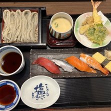 先日の天ばら膳。ご飯の上に海鮮かき揚げ。 一杯めは天丼、次はTKG、3杯目は梅干し薬味入れて出汁かけてお茶漬け(^^)布海苔蕎麦もついてるから満足度高い♡
