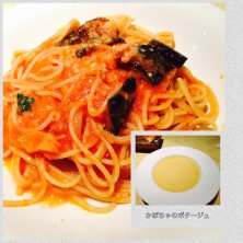 今日のランチ トマトパスタとオイルパスタをシェアして食べました。 スープは、これでも人参の冷たいスープなんですよ。 冷たくてクリーミーで、美味しかったです。