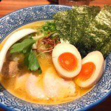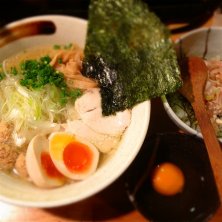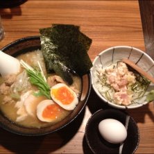新橋です。久しぶりのラーメンです。「麺屋 武一」で濃厚鶏骨醤油そばとささみユッケご飯をいただきました。おそばは、本当に濃厚ですね。ささみユッケご飯は、卵かけごはんに、ささみがのっているもので、おそばに付いていた海苔で巻いて食べると美味しいです。
