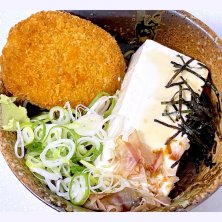 京急ロイヤルフーズ株式会社が運営する立ち食い饂飩(うどん)と蕎麦(そば)の店、えきめんやの期間限定メニュー、豆腐一丁そばにコロッケ乗せ。 豆腐一丁分の絹ごし豆腐、葱、鰹節、海苔、揚げ玉を乗せた蕎麦。饂飩か蕎麦から選ぶ事が出来る。蕎麦気分やったんでこちらにした。コロッケは別途購入して蕎麦にトッピングした。 豆腐がとにかく大きい事に驚いた。でも、好きやし沢山食べられるのが良かった。 雨で電車で通勤途中、折角京急川崎駅の改札内に入ったからたまには食べたくて乗る前に寄った。