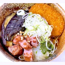京急ロイヤルフーズ株式会社が運営する立ち食い饂飩(うどん)と蕎麦(そば)の店、えきめんやの期間限定メニュー、燻製鴨と揚げ茄子のぶっかけそばにコロッケ乗せ。 燻製された鴨肉、揚げ茄子、大根おろしと葱を乗せた蕎麦。饂飩か蕎麦から選ぶ事が出来る。蕎麦気分やったんでこちらにした。コロッケは別途購入して蕎麦にトッピングした。 雨で電車で通勤途中、折角京急川崎駅の改札内に入ったからたまには食べたくて乗る前に寄った。